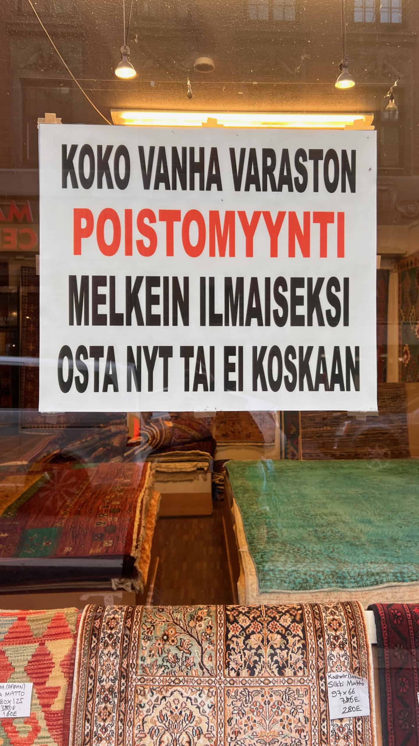 Bonus.Tämä mattokaupan ikkunamainos täyttää kohta 30 vuotta. Paikallinen kivijalkaliike on varmaankin menettänyt paikallisen uskottavuuden vuosia sitten. Tämäntyylinen kampanjointi kun ei vimmaa ostamaan, vaan aiheuttaa epäilystä hinnoittelusta ja kauppiaan rehellisyydestä.